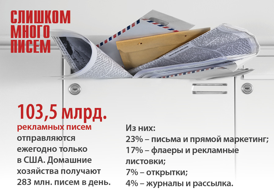 103,5 миллиарда рекламных писем отправляются ежегодно только в США. Домашние хозяйства получают 283 миллиона писем в день.