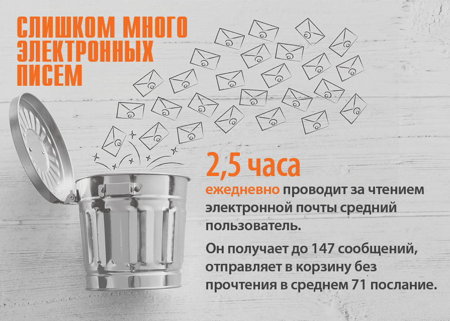 Он получает до 147 новых сообщений, отправляет в корзину без прочтения в среднем 71 послание. Прочтение оставшихся занимает 2,5 часа.