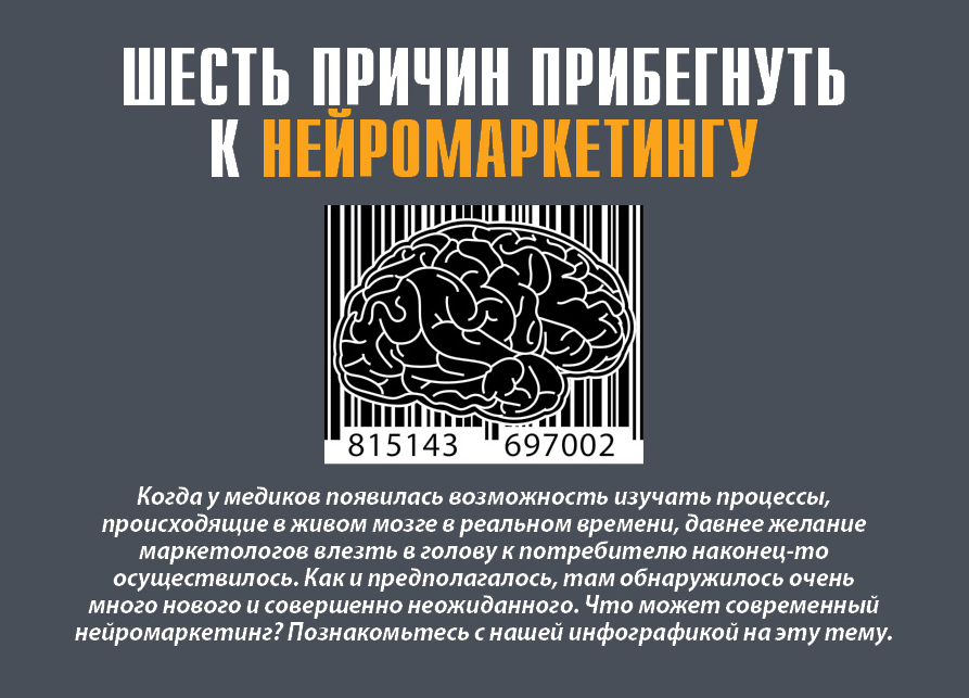 Когда у медиков появилась возможность изучать процессы, происходящие в живом мозге в реальном времени, давнее желание маркетологов влезть в голову к потребителю наконец-то осуществилось. Как и предполагалось, там обнаружилось очень много нового и совершенно неожиданного. Что может современный нейромаркетинг? Познакомьтесь с нашей инфографикой на эту тему.
