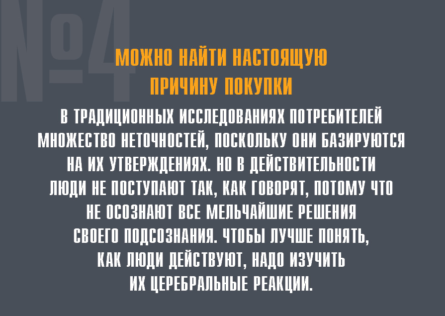 В традиционных исследованиях потребителей множество неточностей, поскольку они базируются на их утверждениях. Но в действительности люди не поступают так, как говорят, потому что не осознают все мельчайшие решения своего подсознания. Чтобы лучше понять, как люди действуют, надо изучить их церебральные реакции.