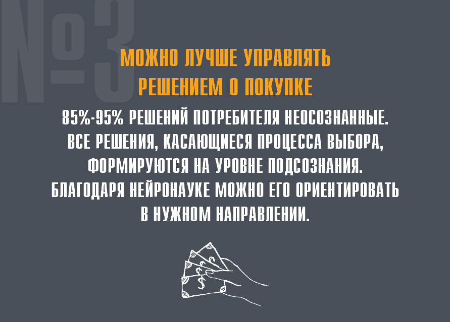 85%-95% решений потребителя неосознанные. Все решения, касающиеся процесса выбора, формируются на уровне подсознания. Благодаря нейронауке можно его ориентировать в нужном направлении.
