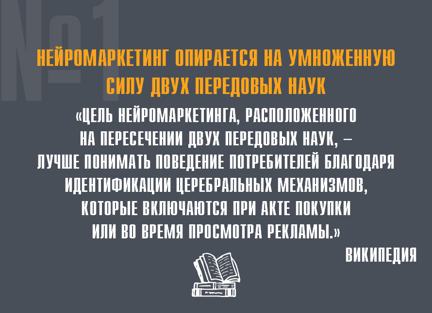 «Цель нейромаркетинга, расположенного на пересечении двух передовых наук, — лучше понимать поведение потребителей благодаря идентификации церебральных механизмов, которые включаются при акте покупки или во время просмотра рекламы». Википедия.