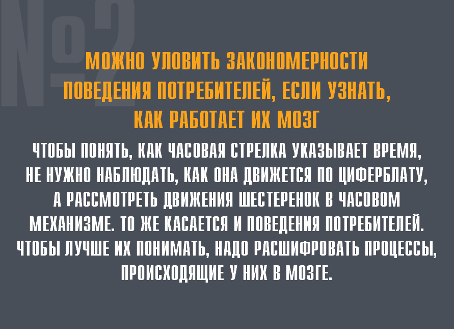 Чтобы понять, как часовая стрелка указывает время, не нужно наблюдать, как она движется по циферблату, а рассмотреть движения шестеренок в часовом механизме. То же касается и поведения потребителей. Чтобы лучше их понимать, надо расшифровать процессы, происходящие у них в мозге.