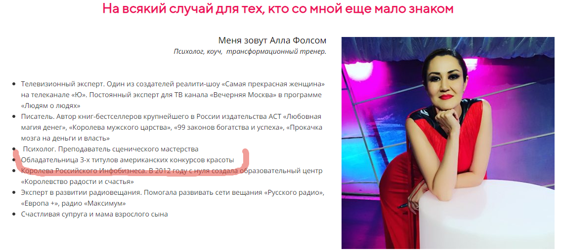 Алла Фолсом (она же Алла Бодиева) называет себя тренером и коучем личностного роста, обладательницей титулов американских конкурсов красоты Mrs. Oregon и Mrs. West Coast, моделью, оперной певицей, драматической актрисой, преподавателем американской школы моделей Immortelle Talent Management, владелицей успешного российского event-агентства Alla Show и королевой российского инфобизнеса. Красиво звучит? Только фальшиво. По всем нотам.