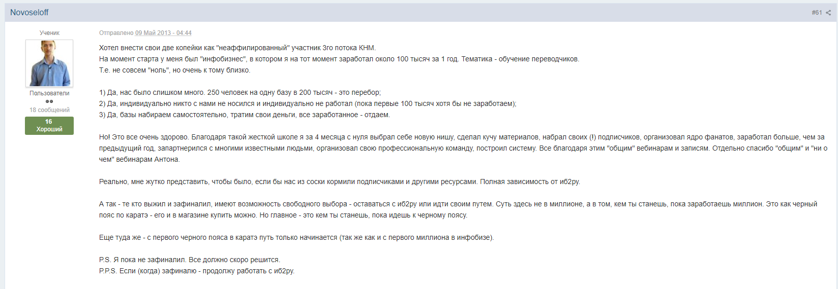 И если бы количество участников было равно КНМ и КНМ 2, то это было бы нормально. Но когда я вначале увидел, что количество участников перевалило за сотню, потом за 200, стало ясно — что это будет нечто. Думал будет жесткий отсев, но и его не было. По факту когда набирается 250 участников и они начинают по базе и2б пиарить хренову тучу бесплатных вебинаров чуть ли не ежедневно (причем у многих вебинары сомнительного качества) — эффект от этой базы начинает стремиться к нулю, хоть там 200К, хоть миллион. И именно поэтому после первых выплат заработанных средств многие участники начали попросту выходить из группы, ибо неясно с какого перепугу отдавать по 50К-100К с продажи курсов, писать статьи на сайте и2б (по сути наполнять его контентом), получая взамен 100 подписчиков. За 100К можно привлечь в базу 10.000 подписчиков, и то это считается дорого.