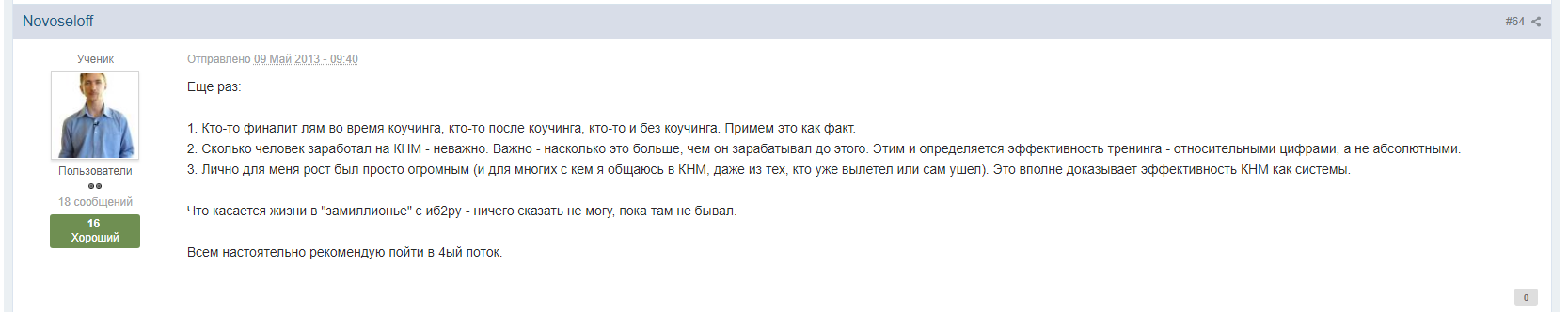 2. Сколько человек заработал на КНМ — неважно. Важно — насколько это больше, чем он зарабатывал до этого. Этим и определяется эффективность тренинга — относительными цифрами, а не абсолютными.