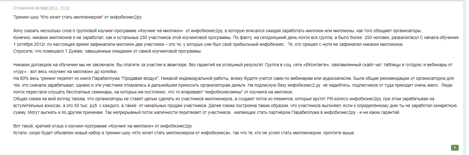 На 80% весь тренинг перепет из книги Парабеллума “Продавая воздух”. Никакой индивидуальной работы, всему будете учится сами по вебинарам или аудиозаписям. Были общие рекомендации от организаторов для тех, кто сначала зарабатывал, однако и эти участники отказались в дальнейшем приносить организаторам деньги. На подписную базу инфобизнес2.ру не надейтесь, подписчиков от туда приходит очень мало. Люди почти перестали слушать бесплатные семинары, на которых им постоянно, что то впаривают “инфобизнесмены” от коучинга на миллион.