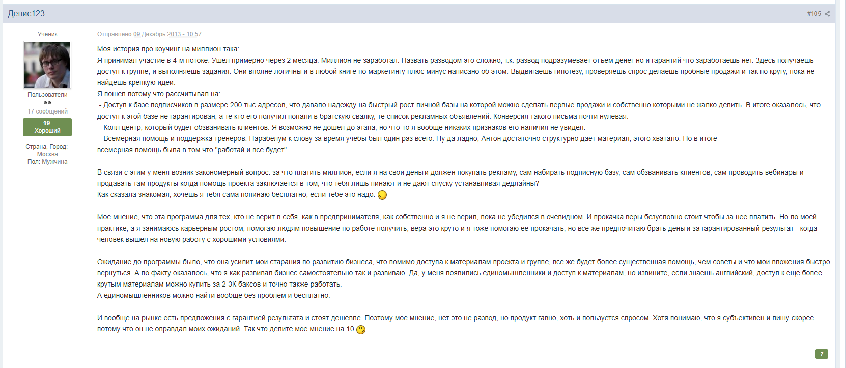 И, наконец, Константин Живенков, автор одного из громких разоблачительных отзывов, с гневной отповедью, в которой он рассказывает, почему и сам оказался среди тех, кто хвалил «Коучинг на миллион», и почему неглупый, опытный предприниматель «попался»: