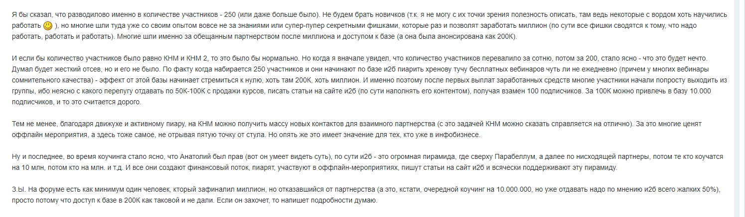 З.Ы. На форуме есть как минимум один человек, кторый зафиналил миллион, но отказавшийся от партнерства (а это, кстати, очередной коучинг на 10.000.000, но уже отдавать надо по мнению и2б всего жалких 50%), просто потому что доступ к базе в 200К как таковой и не дали. Если он захочет, то напишет подробности думаю».