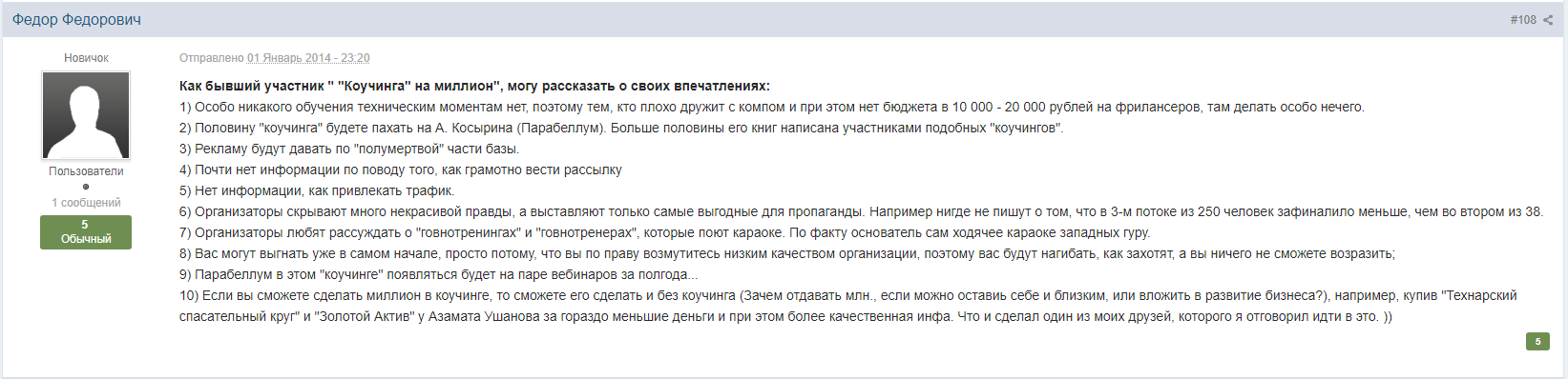 Очевидно, что настоящих миллионеров за все время прохождения коучинга было двое — Косырин и Ельницкий, которые прилично заработали на вступительных взносах “за попробовать”, а также от начальных продаж участников своих инфопродуктов, деньги от которых им не возвращаются.