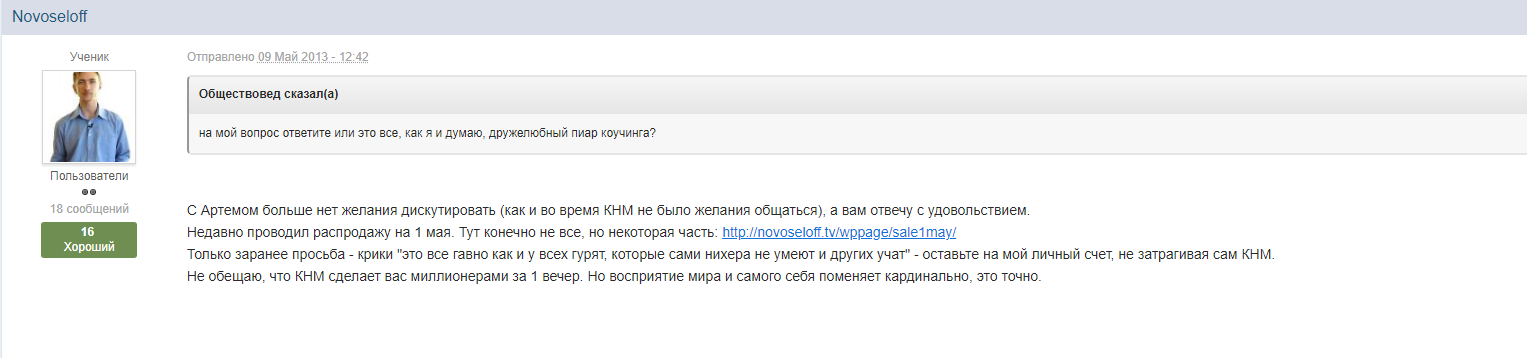 10) Если вы сможете сделать миллион в коучинге, то сможете его сделать и без коучинга (Зачем отдавать млн., если можно оставиь себе и близким, или вложить в развитие бизнеса?), например, купив “Технарский спасательный круг” и “Золотой Актив” у Азамата Ушанова за гораздо меньшие деньги и при этом более качественная инфа. Что и сделал один из моих друзей, которого я отговорил идти в это. ))».