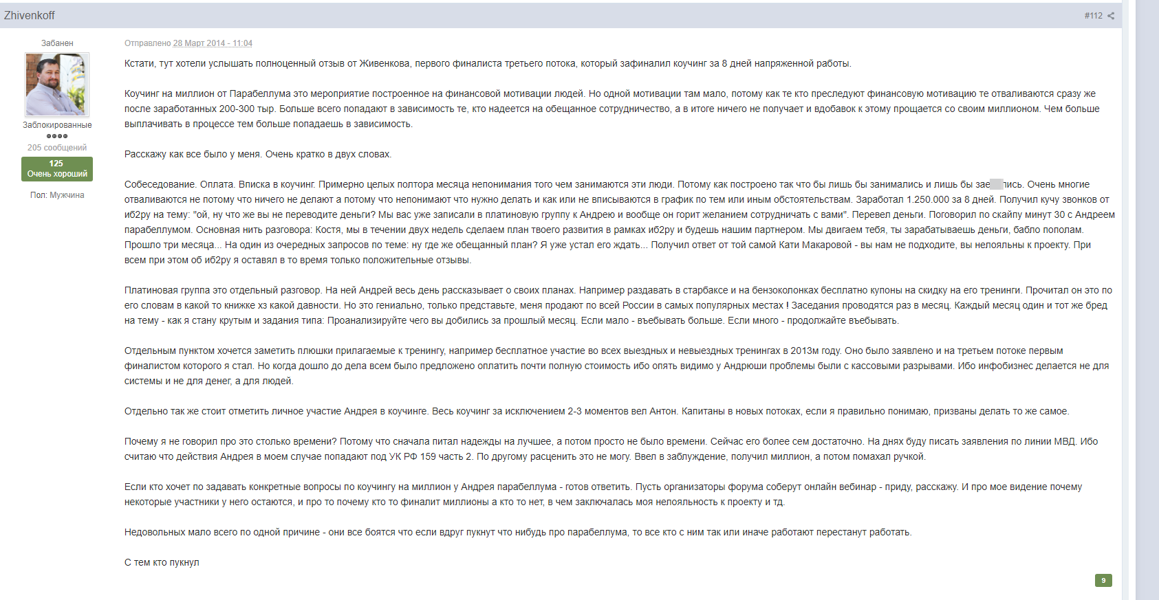Учитель Марк Куличков, вдохновленный успехами Парабеллума, назанимал у друзей денег и оплатил коучинг на миллион. А затем выяснил, что на сайте его забанили, и получил от «гуру» видеозапись, в которой прямым текстом был послан «на ***й» без объяснения причин.