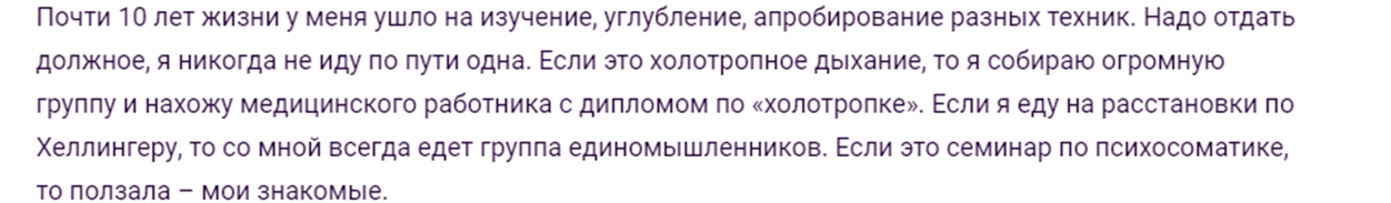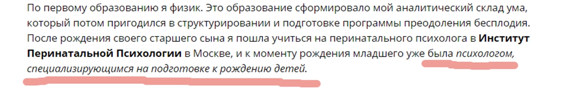 Но, как мы видим, по образованию наш «психолог» — физик. А «специализацию» получала в шарашкиной конторе. Равно как и «народный доктор» с совершенно неясным мастерством, переданным от «медицинского работника с дипломом по холотропке». Вывод ясен.