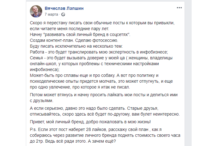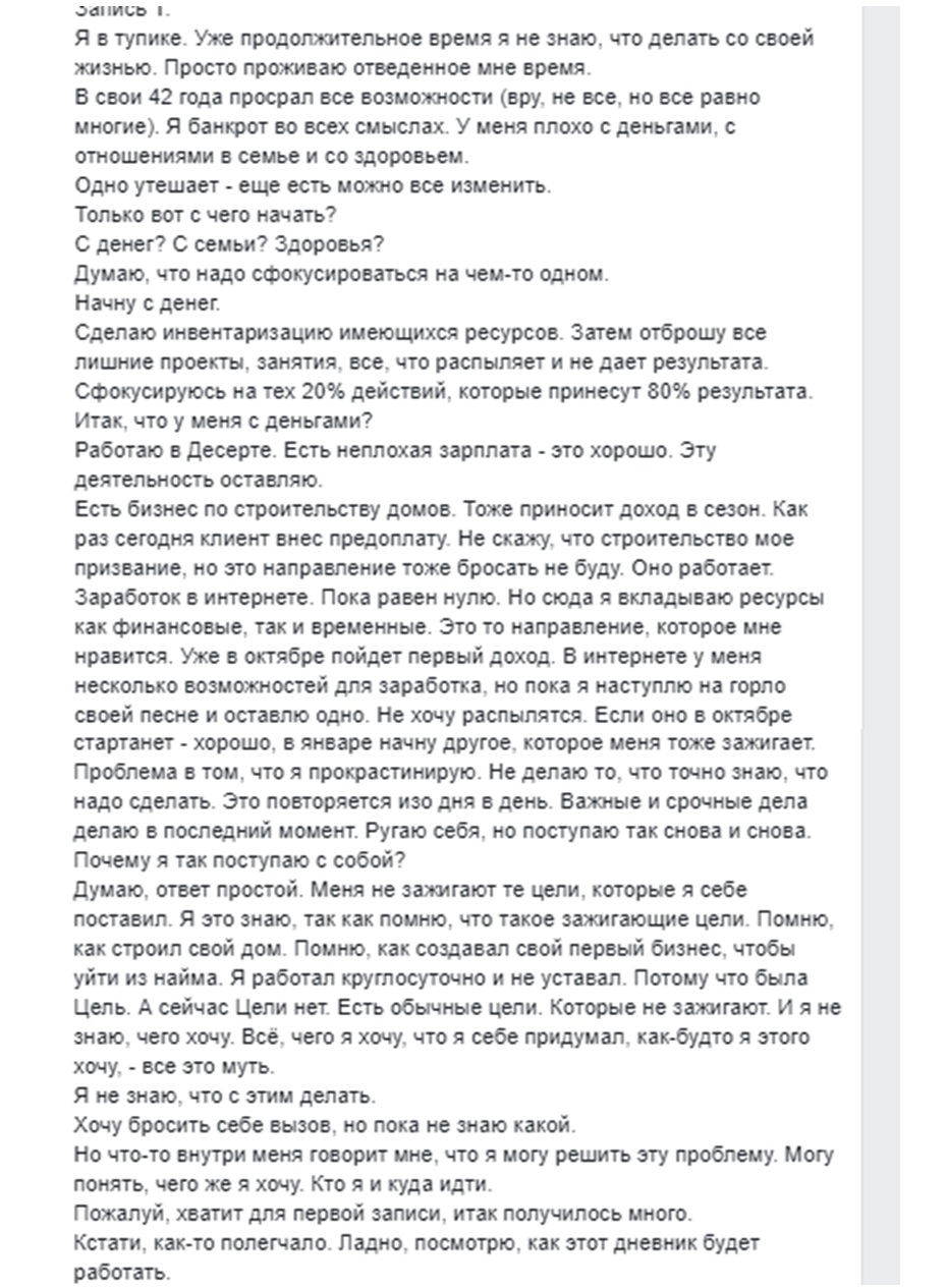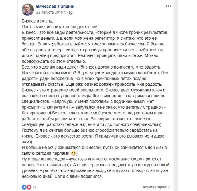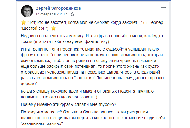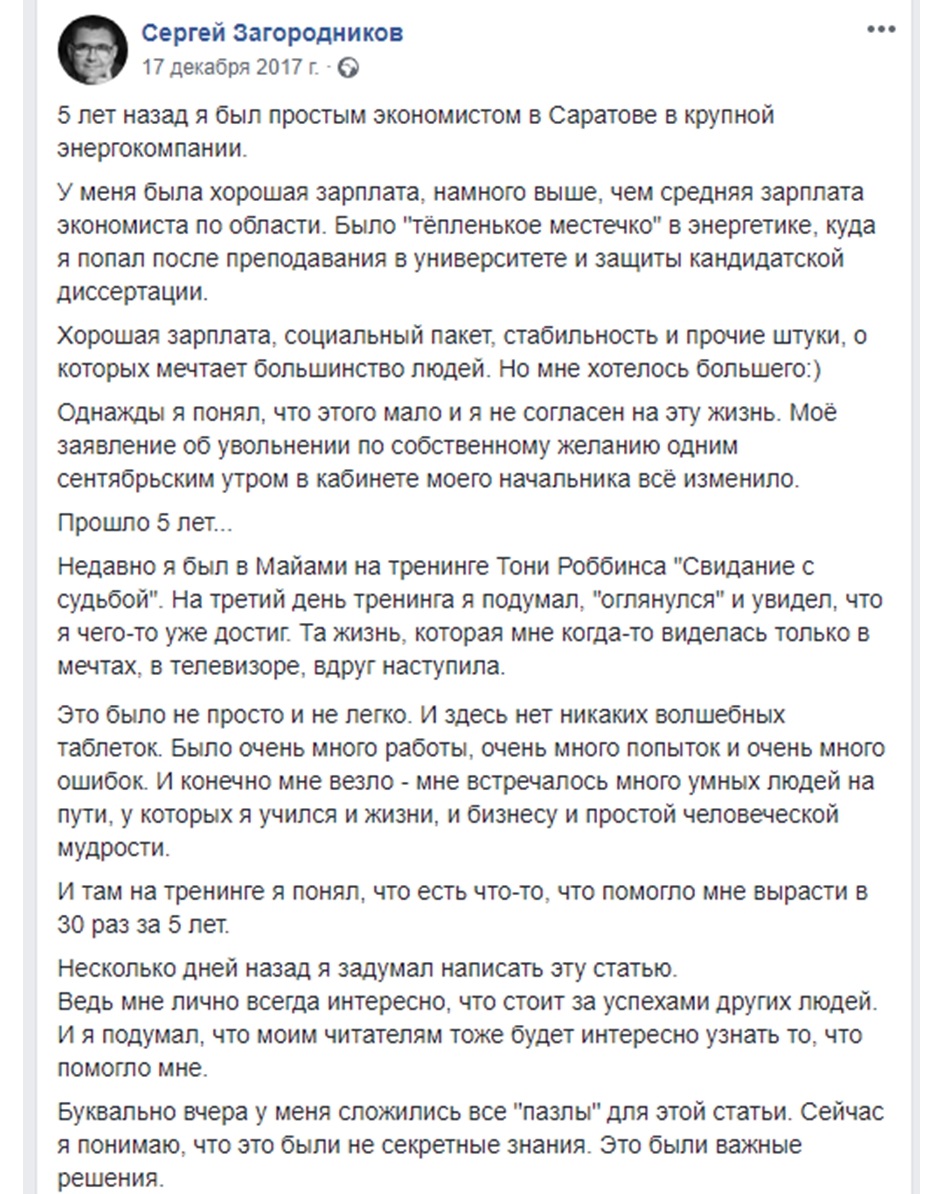 Как вы можете наблюдать, все актуальные успехи Загородникова-инфобизнесмена — родом из его «самокопаний» после посещения семинара Тони Роббинса, а вот посты про хоть какие-нибудь инсайты после «учебы» в интернет-университете на его стене не фигурируют.