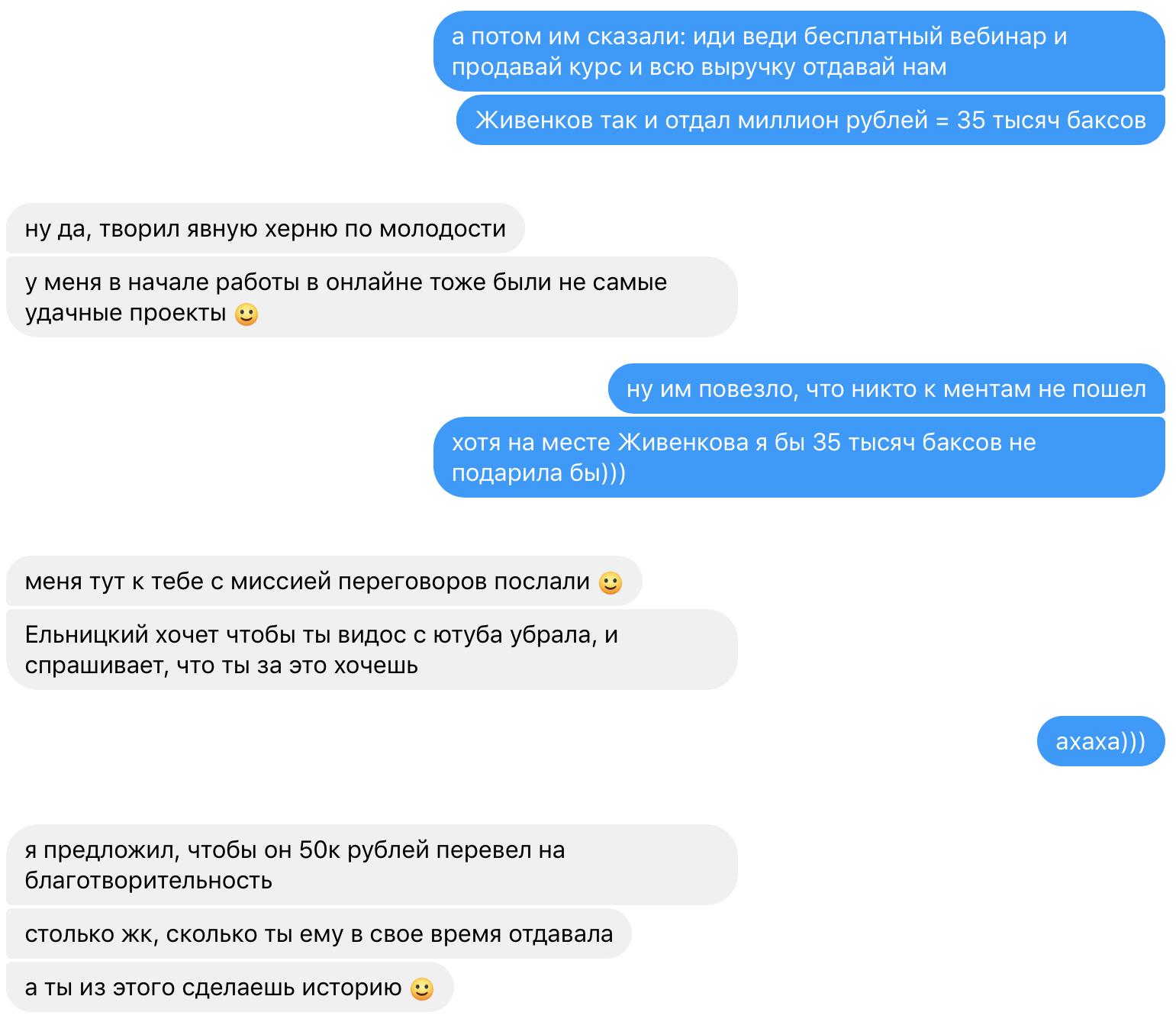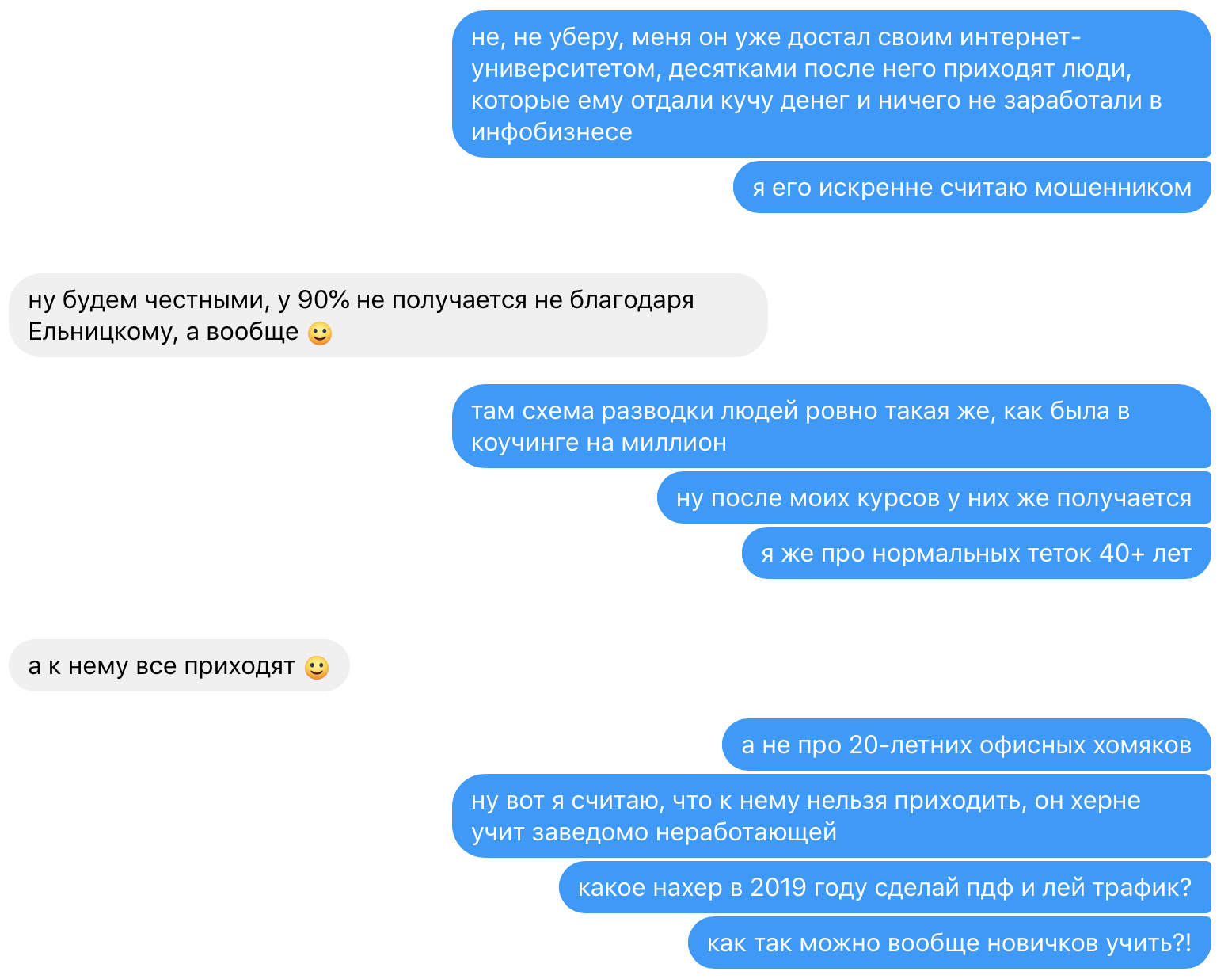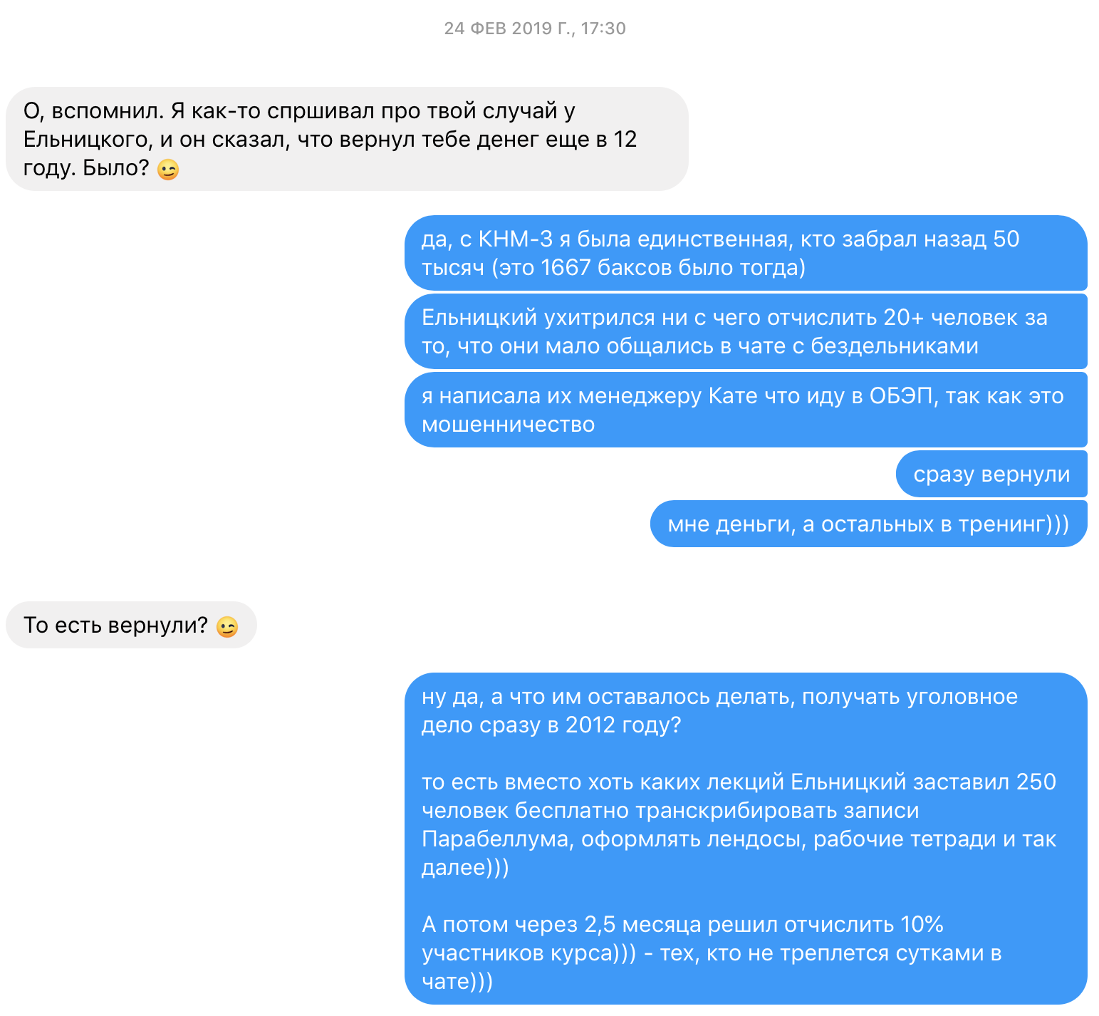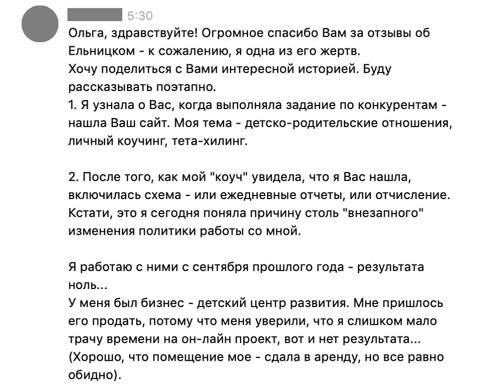 «Через 2,5 месяца Ельницкий принял нашу работу и отчислил 20+ человек — без возврата денег, разумеется. Только скинув менеджеру Парабеллума Кате заявление в ОБЭП (об их афере), я забрала назад оплаченные за “Коучинг на миллион” деньги.