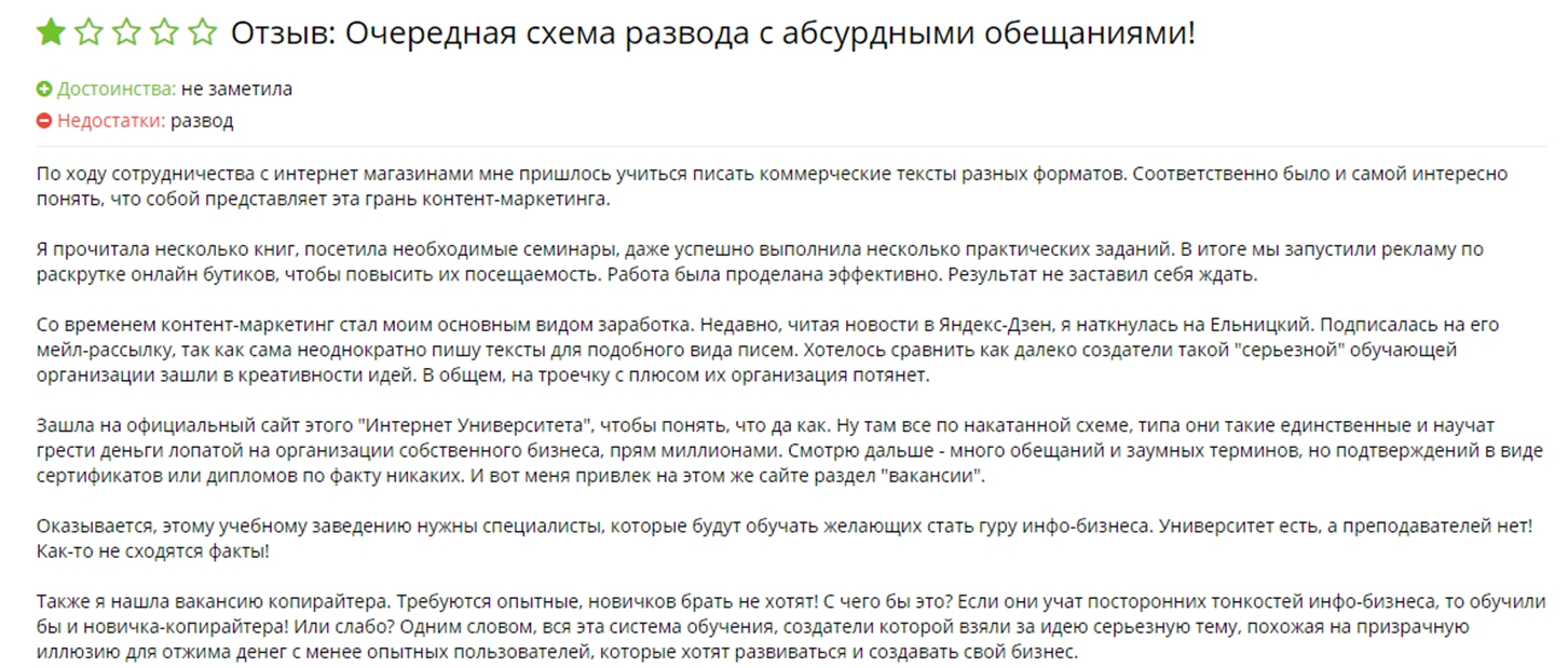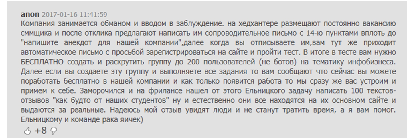 «Компания занимается обманом и вводом в заблуждение. на хедхантере размещают постоянно вакансию сммщика и после отклика предлагают написать им сопроводительное письмо с 14-ю пунктами вплоть до “напишите анекдот для нашей компании”, далее когда вы отписываете им, вам тут же приходит автоматическое письмо с просьбой зарегистрироваться на сайте и пройти тест. В итоге в тесте вам нужно БЕСПЛАТНО создать и раскрутить группу до 200 пользователей (не ботов) на тематику инфобизнеса. Далее если вы создаете эту группу и выполняете все задания то вам сообщают что сейчас вы можете поработать бесплатно в нашей компании и как только появится работа то мы сразу же вас устроим и примем к себе. Заморочился и на фрилансе нашел от этого Ельницкого задачу написать 100 текстов-отзывов “как будто от наших студентов” ну и естественно они все находятся на их основном сайте и выдаются за реальные. Надеюсь мой отзыв увидят люди и не станут тратить время, а я вам помог. Ельницкому и команде рака яичек)».