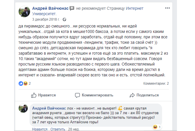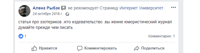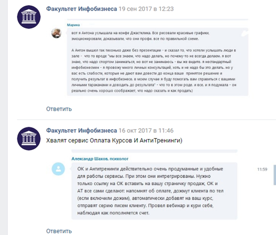 В сети «ВКонтакте» происходит нечто еще более мистическое, там реальные отзывы людей подменяются публикациями самого факультета инфобизнеса с неясными скринами непонятных людей.