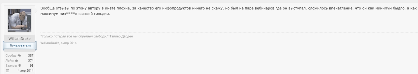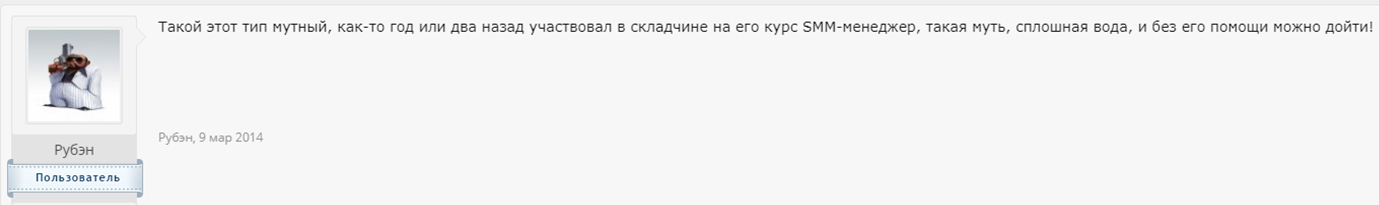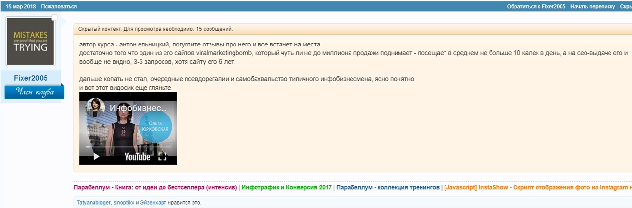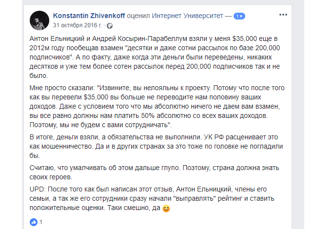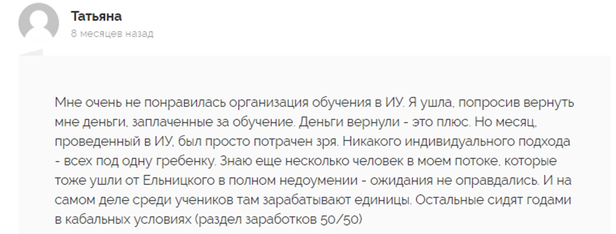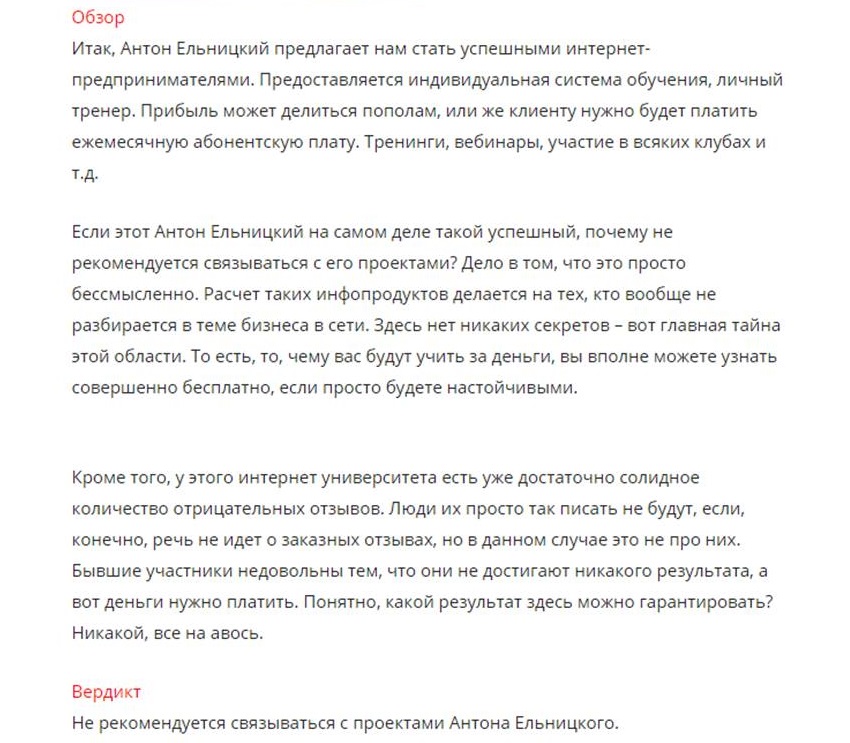 Так называемое «обучение» почему-то восторженные отзывы вызывает только у тех, кто публикует их на страницах сайта. Везде, где есть хоть какие-то независимые упоминания Антона Ельницкого и где их нельзя модерировать, формат впечатлений несколько иной.