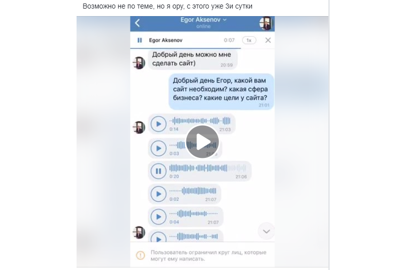 Ну а теперь вишенка: некто Егор Аксенов, ученик Бизнес-молодости в одночасье стал звездой узких кругов Фейсбука, а точнее, всех маркетологических и пиарных групп, где со скоростью агрессивного вируса распространилась аудиозапись его попытки заказать себе лендинг.