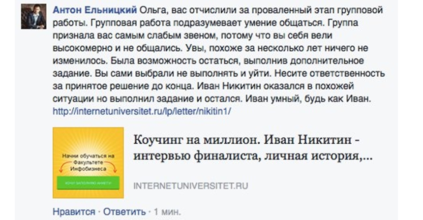 Ельницкий меня отчислил из третьего потока. Просто цирк. По мнению Ельницкого, обучение бизнесу — это многочасовой пустой треп в скайп-чате с юными бездельниками. А кто не тратит ежедневно несколько часов на бесполезные пустые переписки, тот высокомерен. И отчислил он меня совершенно правильно. Потому что я не сумела пройти этап групповой работы. :)