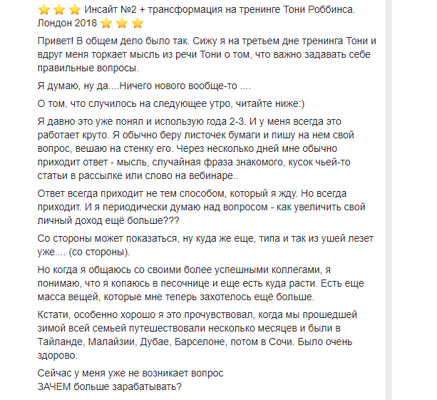 В реальности за два года учебы и работы с Антоном и еще два года после расставания Сергей так и не смог выйти на уровень серьезных заработков. Осознать, как работать в системе инфобизнеса, смог только после посещений конференций Тони Роббинса, о чем неоднократно писал у себя на странице. Про Антона — ни слова.