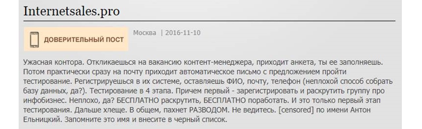 «Ужасная контора. Откликаешься на вакансию контент-менеджера, приходит анкета, ты ее заполняешь. Потом практически сразу на почту приходит автоматическое письмо с предложением пройти тестирование. Регистрируешься в их системе, оставляешь ФИО, почту, телефон (неплохой способ собрать базу данных, да?). Тестирование в 4 этапа. Причем первый — зарегистрировать и раскрутить группу про инфобизнес. Неплохо, да? БЕСПЛАТНО раскрутить, БЕСПЛАТНО поработать. И это только первый этап тестирования. Дальше хлеще. В общем, пахнет РАЗВОДОМ. Не ведитесь. [censored] по имени Антон Ельницкий. Запомните это имя и внесите в черный список».