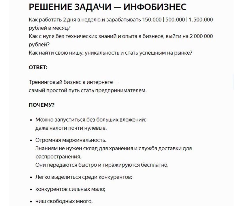 Оплатившие устаревшее обучение новички страдают, засыпанные заданиями, получая невероятное количество пустой, водянистой информации по всем темам, и им говорят — выбери нишу, область знаний, в которой ты малокомпетентен, и дальше им предлагается обманывать своих будущих учеников, рассказывая сказки о своей компетентности, великих доходах и т.д. Но прошли те сладкие времена, когда подписчики верили во вранье инфошарлатанов. Сейчас потенциальные клиенты относятся со скепсисом к пустым словам и начинают проверять все факты.