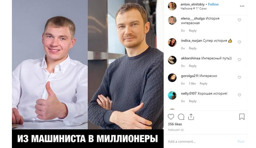 Зато попутно обнаружили, что в «Инстаграме» Антона Ельницкого явно накручены комментарии. Из поста в пост перебегают одни и те же люди, пишущие односложные бессмысленные комментарии, а то и вовсе смайлики. Без дискуссий, без малейшего отношения к теме. Просто «для количества».