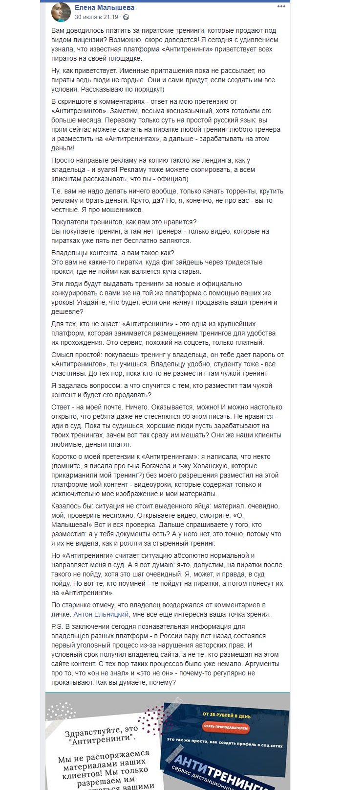 «Вам доводилось платить за пиратские тренинги, которые продают под видом лицензии? Возможно, скоро доведется! Я сегодня с удивлением узнала, что известная платформа "Антитренинги" приветствует всех пиратов на своей площадке.