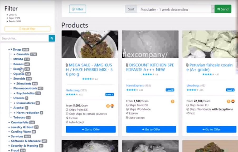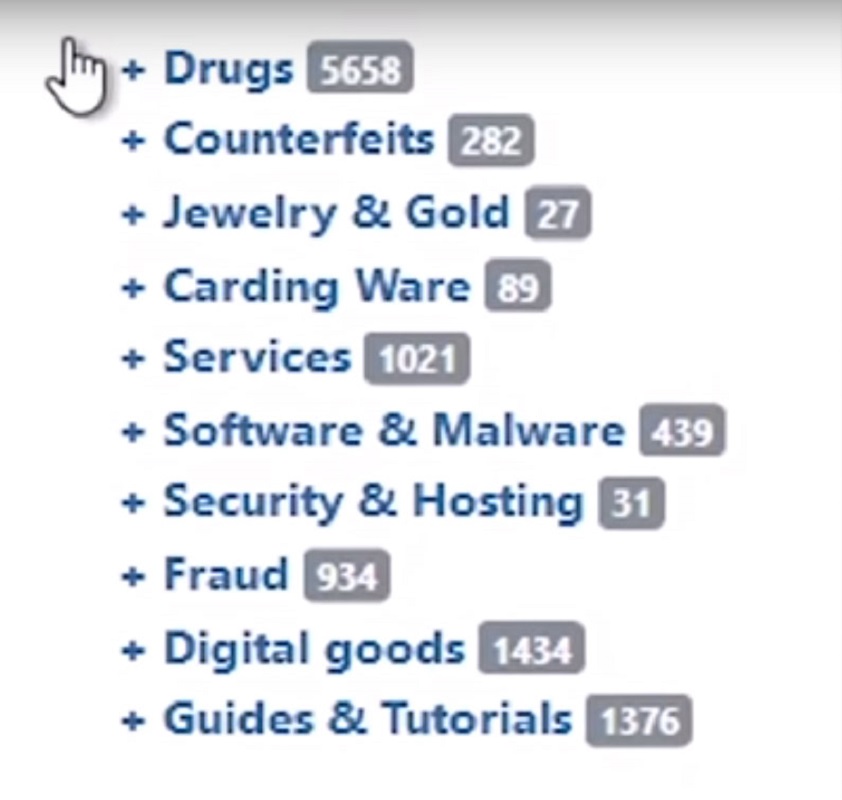 Мы видим, что на этом конкретном сайте нет оружия, но есть наркотики, поддельные бренды, ювелирные украшения, кредитные карты.