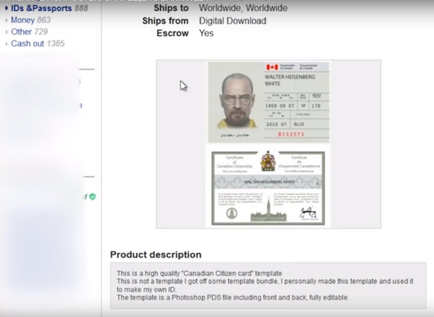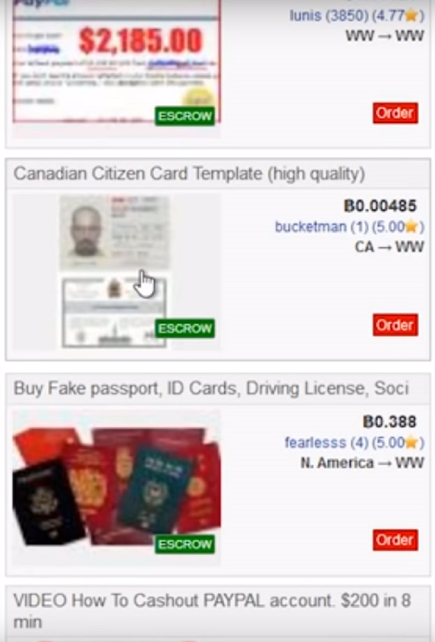 Здесь паспорта и все виды поддельных документов и удостоверений. Предположим, я хочу паспорт гражданина Канады. Это будет стоить мне всего 31 доллар!