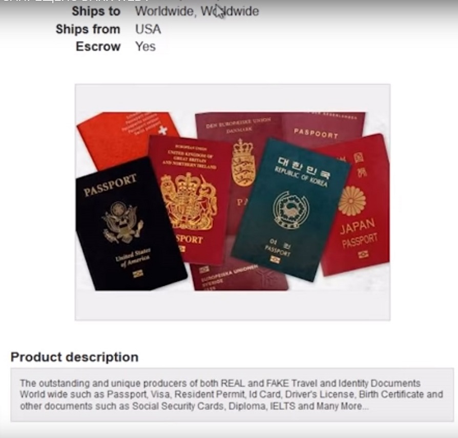 Для паспортов и всех других документов есть еще один продавец, который почти за 2500 долларов предлагает вообще любой документ любой страны. Скажите честно, вы готовы отправить такие деньги продавцу с такого сайта? Сначала вам придется добыть криптовалюту. Потом вы заплатите не непосредственно продавцу, а положите деньги на счет этого сайта. Затем сайт переводит деньги на счет продавца, который присутствует на сайте. И только потом продавец получает доступ к вашей оплате. То есть, как видите, множество этапов при осуществлении платежа, но гарантий, естественно, абсолютно никаких ни на каком этапе. Если вдруг по каким-то причинам сайт закрывается, и продавец, и покупатели теряют все свои деньги.