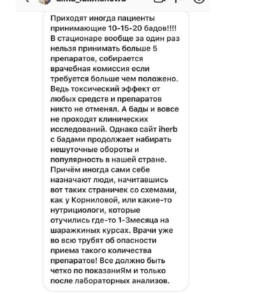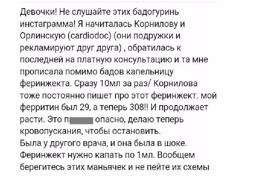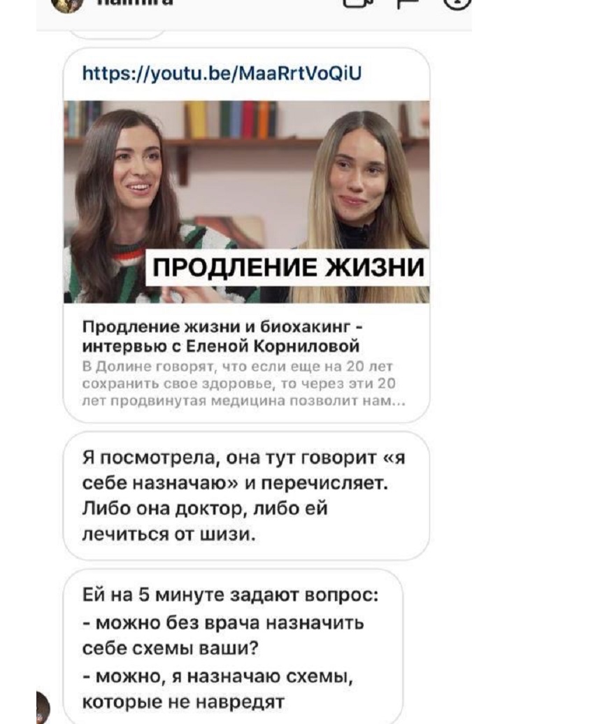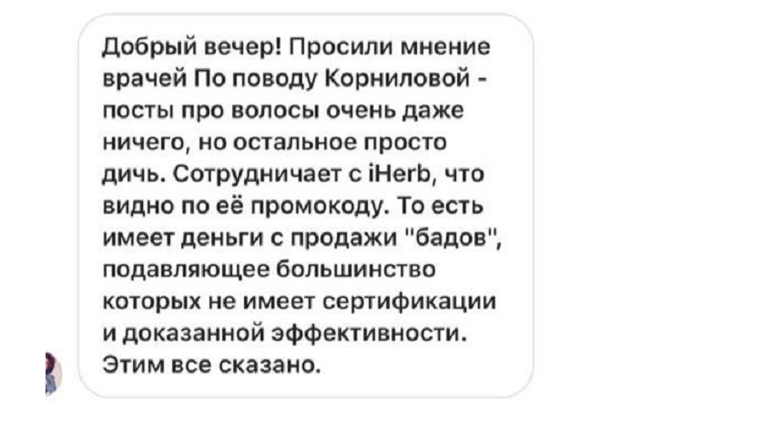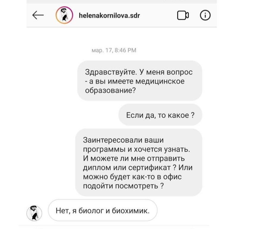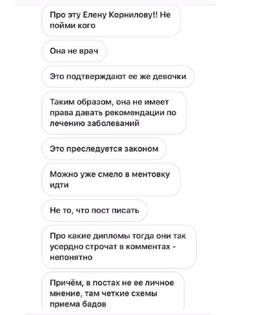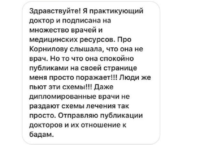 Елена Корнилова говорит о том, что ее врачи рекомендуют и участвуют в ее вебинарах, квалификация этих врачей под сомнением. Вот, например, переписка с https://instagram.com/cardiodoc. Подруга и коллега Корниловой, они друг друга рекламируют.