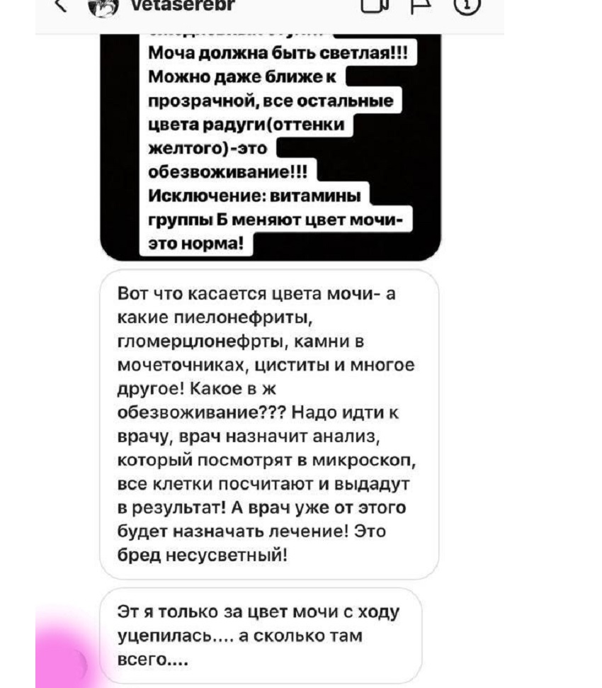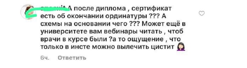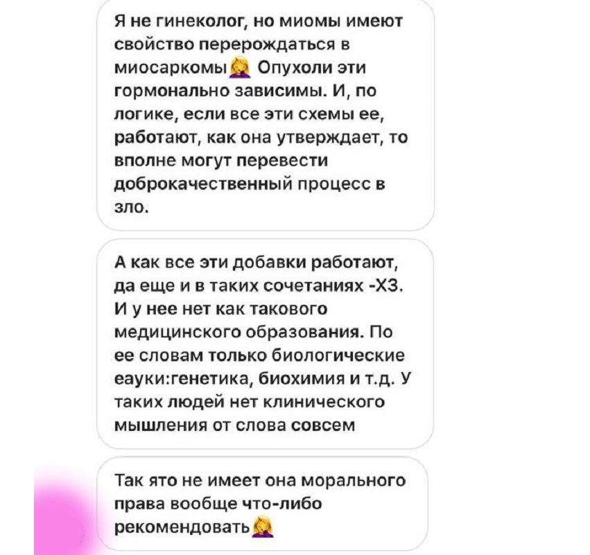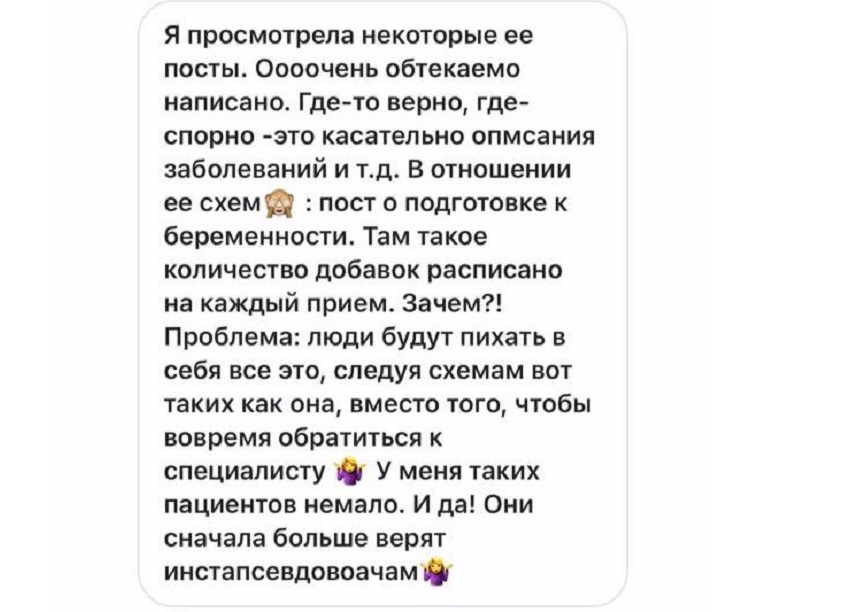 Мы уже знаем, что Корнилова не имеет никакого отношения к врачебной и лечебной деятельности, соответственно, у нее нет морального права выписывать схемы и протоколы лечения. Даже если бы она была «биохимиком, магистром, технологом», то ни врач, ни педиатр, ни иммунолог, ни гинеколог не имеют права, ни морального, ни документального, этого делать.