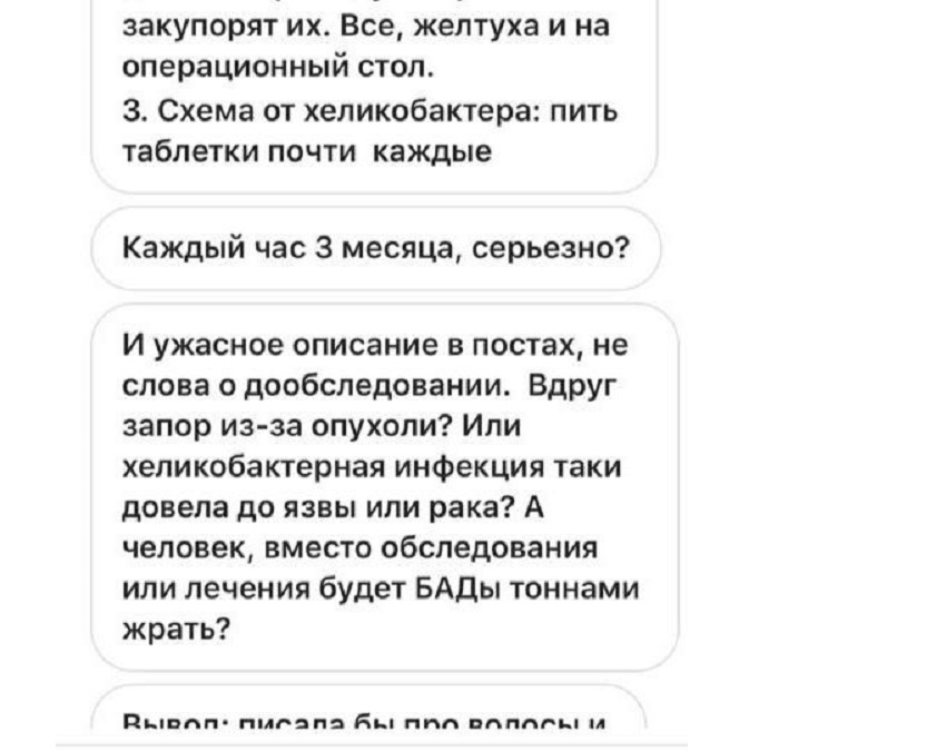 Подписчики Елены рассказывают историю о ее победе над туберкулезом с помощью БАДов, в интервью она рассказывает о победе над другой болезнью — резистентным стафилококком, подтверждения ни той болезни, ни другой никто не видел, чтобы было написано: диагноз такой-то.