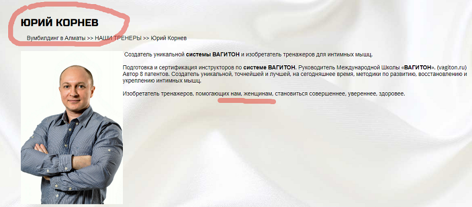 Следующим адептом вагинального управления стал Юрий Корнев, ныне руководитель некой международной школы «Вагитон». Себя он тоже называет изобретателем тренажеров, «помогающих нам, женщинам, становиться совершеннее, увереннее, здоровее» (цитата с сайта). Нам, женщинам? Ну ладно, сейчас трансгендерность в почете.