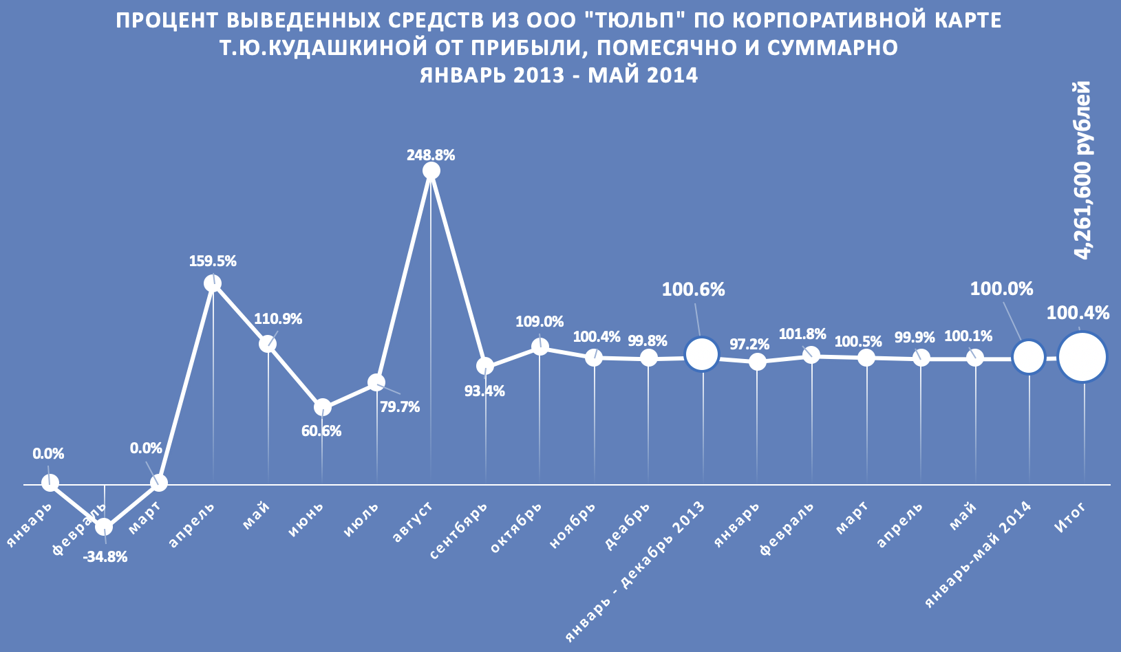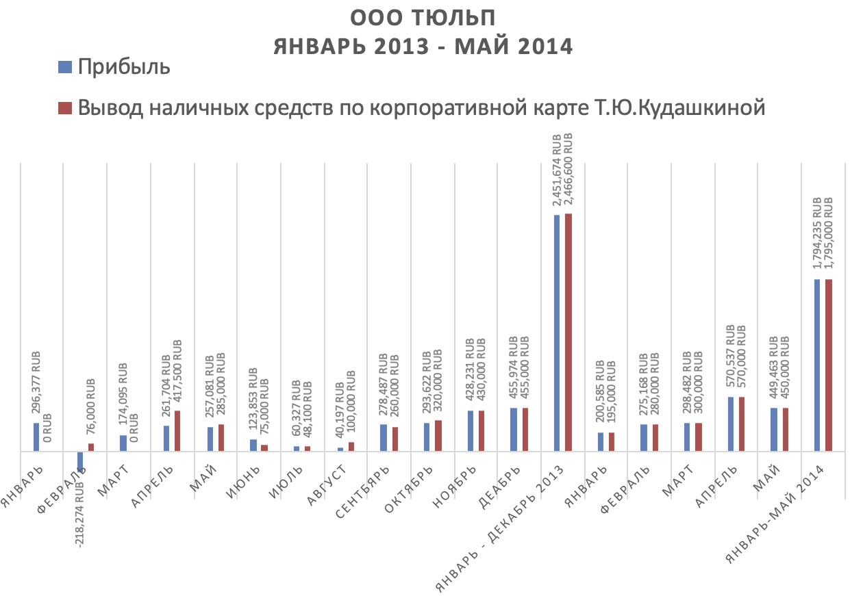 Финансовый анализ показал, что суммы, которые Таисия Кудашкина снимала с корпоративной банковской карты, были с высокой точностью равны разнице между доходами и расходами ООО «Тюльп.ру».