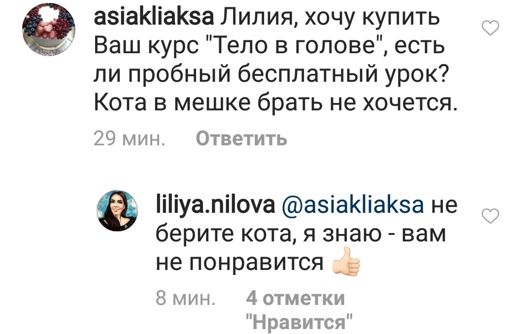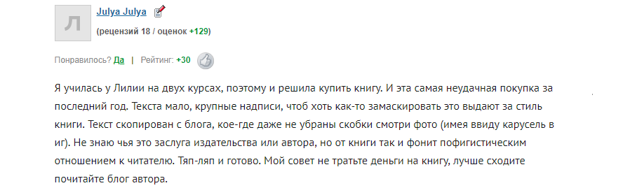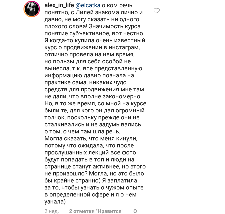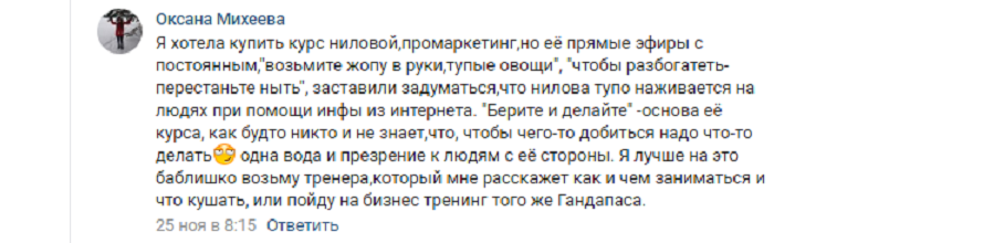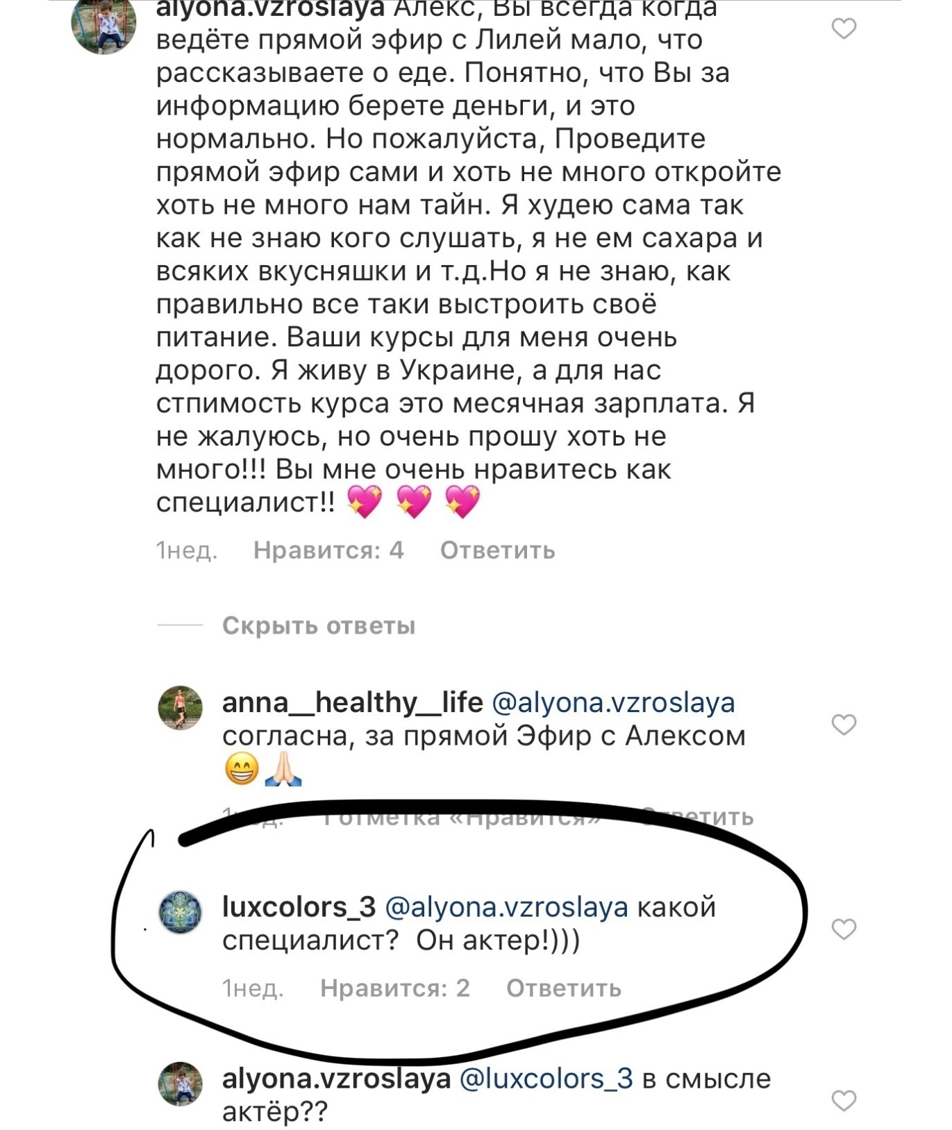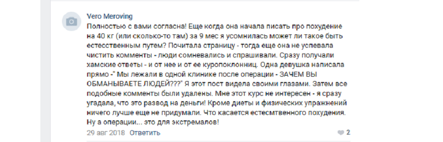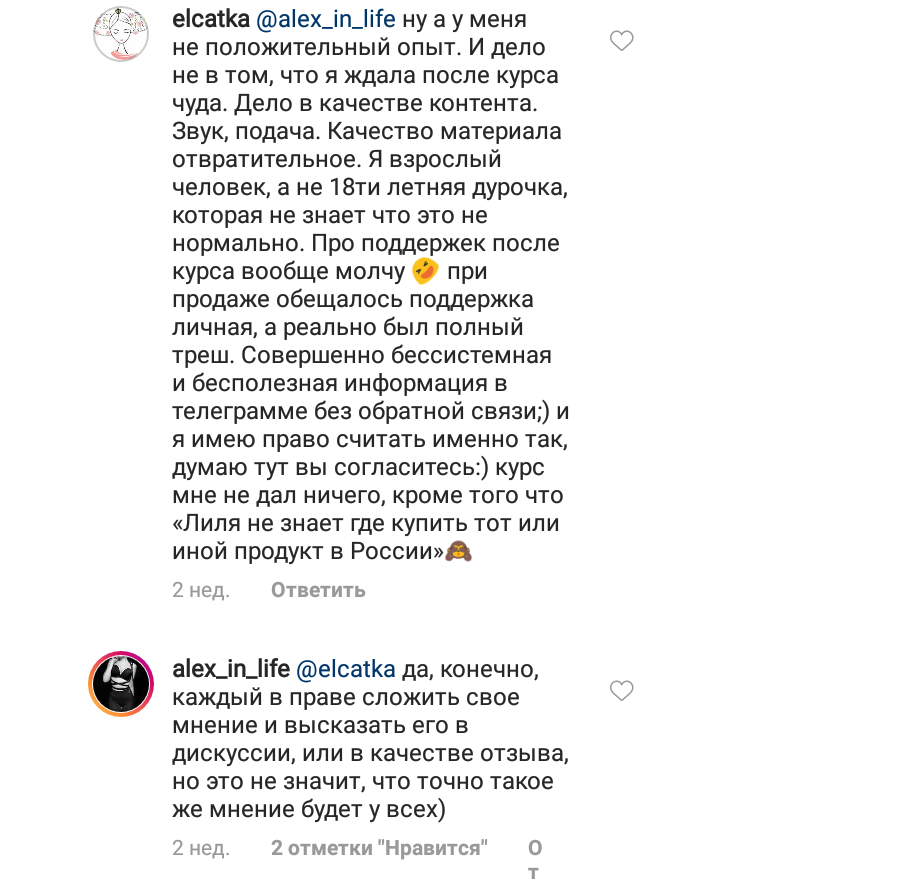 Следующий отзыв повествует о тотальном разочаровании: «Я прямо негодую. Не могу себя назвать полным профаном в теме теории похудения и пр., поэтому "так много информации", которые они с Алексом ("нутрицевтом от бога") подготовили, для меня — это просто пшик. Как уже кто-то сказал в комментариях, которые успела прочитать, основа этого курса — это кетодиета. Но все то, что она не ест — это слово в слово учение Алекса. Но, люди, как же меня начало бомбить, когда этот Алекс рассказывал про то, что не ест мяса, потому что коровы пукают и делают озоновые дыры. Весь курс — это переливание из пустого в порожнее. В каждом уроке минут по 40 о том, как Лиля похудела, как было раньше хреново, и как теперь отлично».