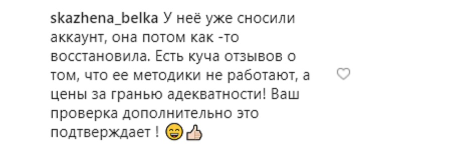 «Слежу за ней еще со времен ЖЖ, в Инсте помню ее еще до всяких курсов. Первое похудание, мотивашки, трени до упаду, и все такое прочее. В этот же период она начинала продавать в своей инсте леггинсы спортивные с принтами. Все это давно убито, и концы зачищены. То же самое было с какими-то кофтами.