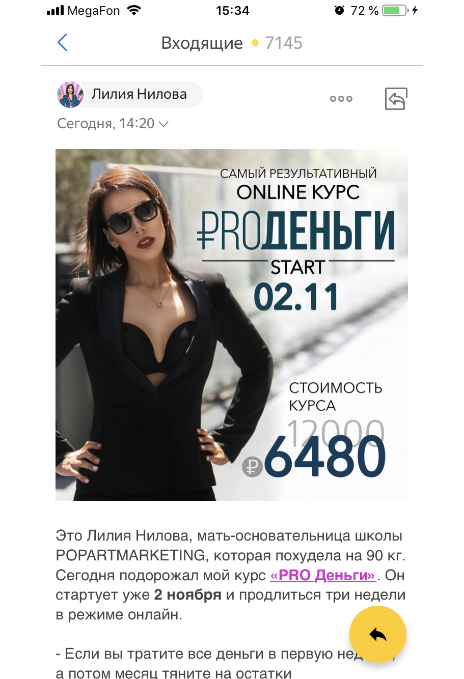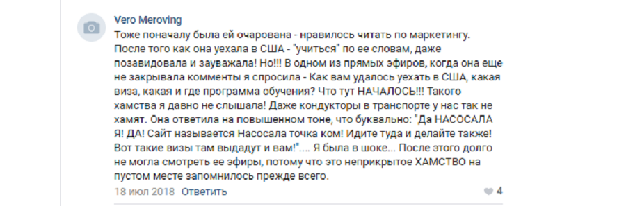 Купила ее курс попартмаркетинга, была во втором наборе. С третьего набора она хотя бы в описание своего курса поставила, что продвижение у нее дается только в Инстаграме. В итоге я купила самый дорогой вариант (хочуслилей), к четвертому занятию до меня доперло, что Инстаграмом все дело и ограничится. У нас с ней состоялся короткий чатик, типа, — WTF??? — ЭЭэ, ну вот так. Курс я этот забросила за ненадобностью. Деньги на ветер.