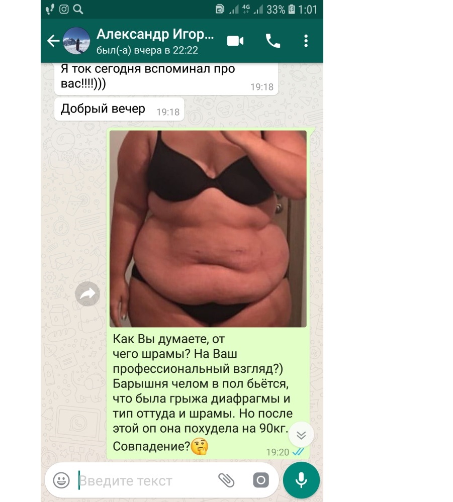 — шрамы наглядно свидетельствуют о бариатрической операции, то есть обыкновенном ушивании желудка.