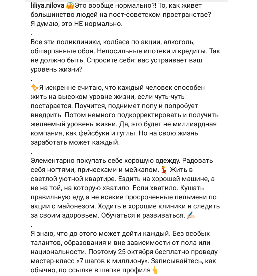 Понятно, что косвенно, тем не менее этот факт — одно из мощных доказательств реальной «ценности» Лилии как инстамаркетолога и ее «полезных советов», как зарабатывать миллионы в «Инстаграме».