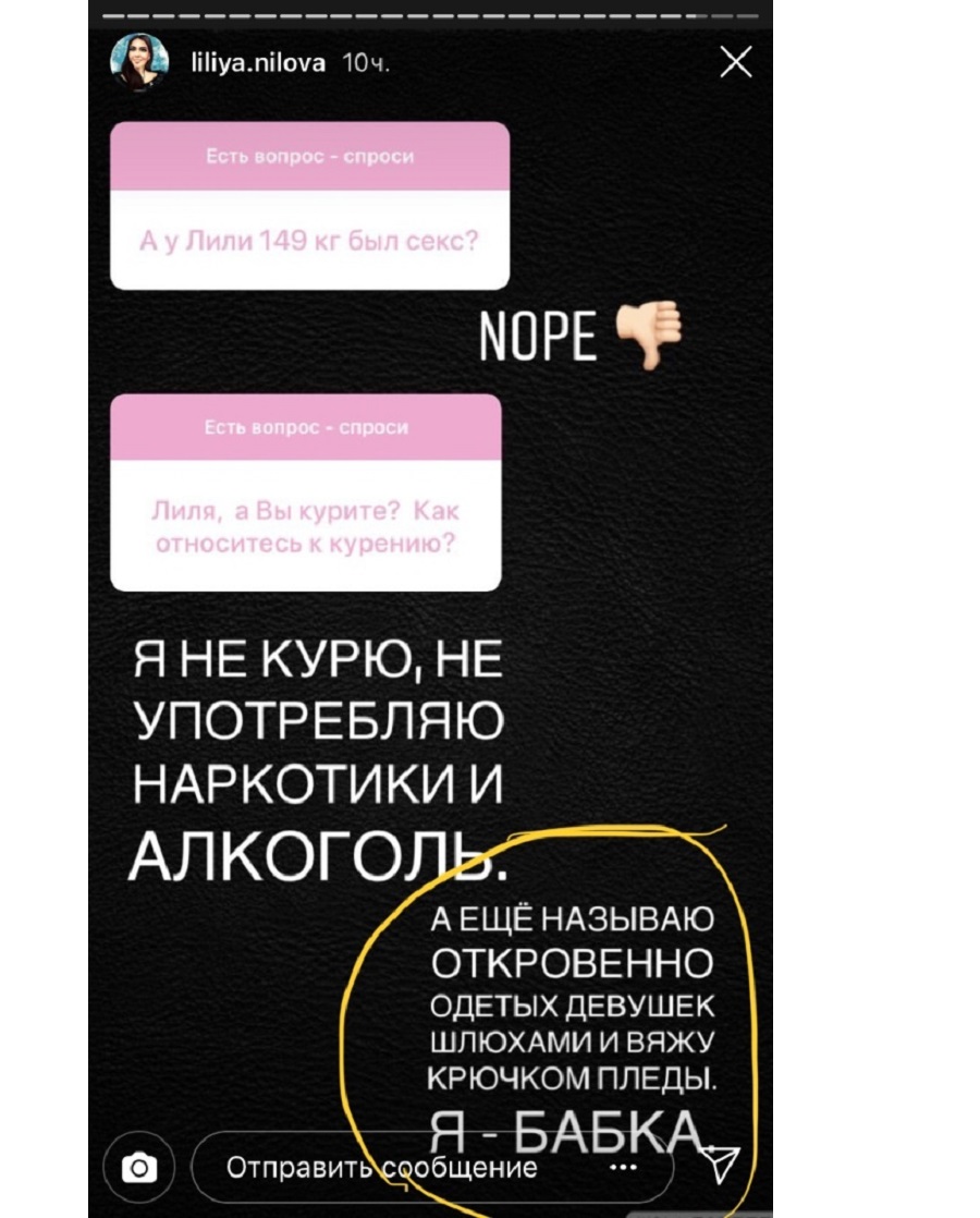 Лилия называет малоодетых девушек шлюхами, при этом смело фотографируется в неглиже, а то и вовсе с оголенным задом.