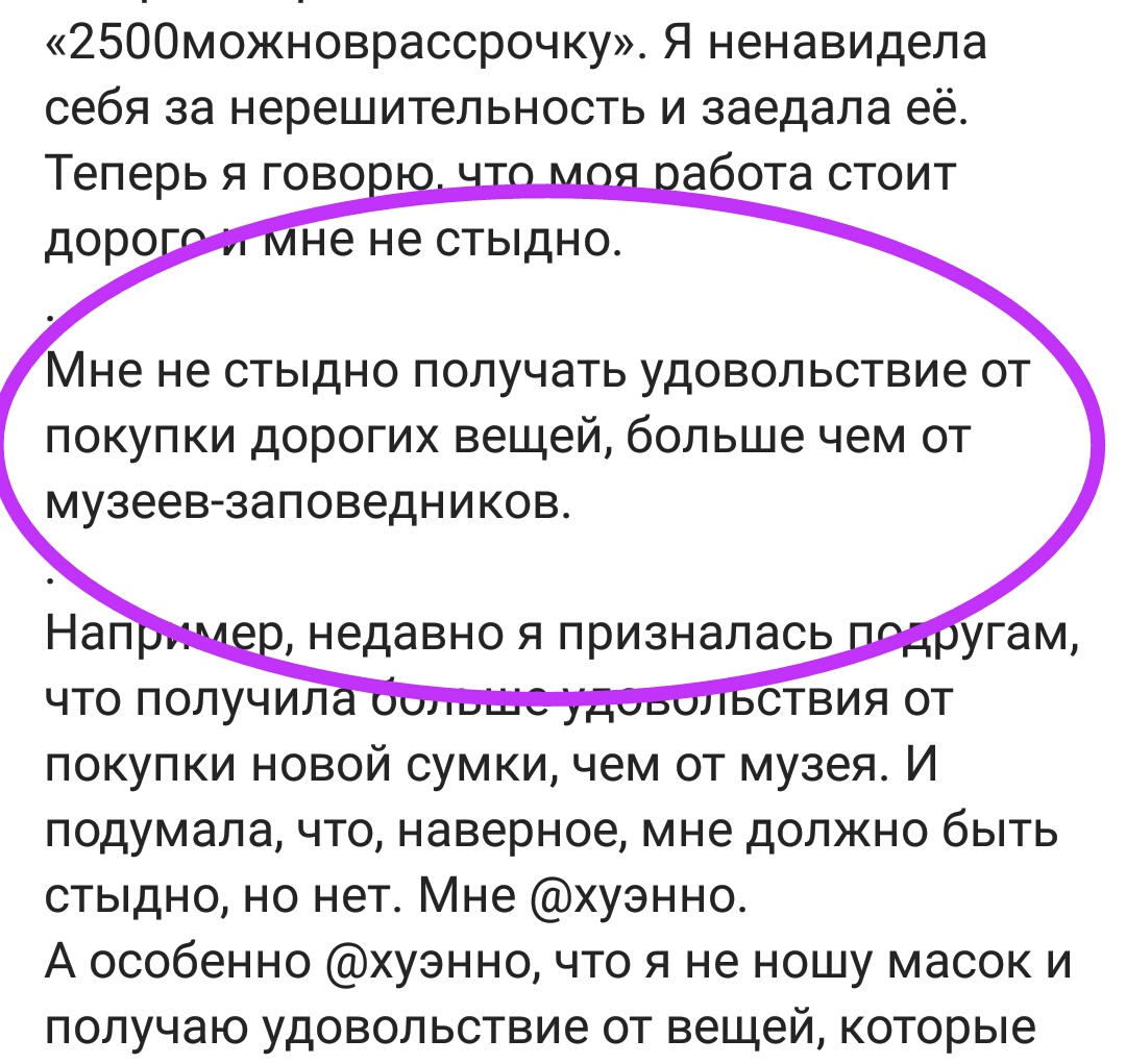 Еще одна непоследовательная странность — отношение к одежде: сначала отрицание, а затем постоянное хвастовство покупками дорогих брендов.