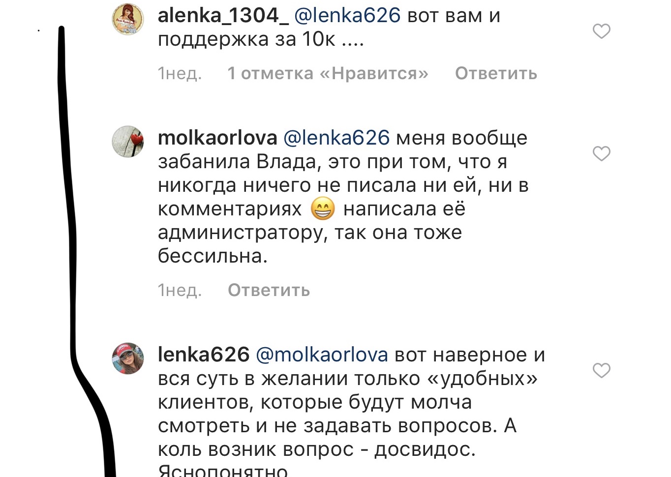 И здесь ложь. Лилия, даже похудев, продолжает активно фотошопить свои снимки, потому что «вылезает» то одно, то второе с той же регулярностью, что и раньше. Но разве так можно продать дорогущий курс, где за 10 тысяч поддержка пользователей превращается в бан?