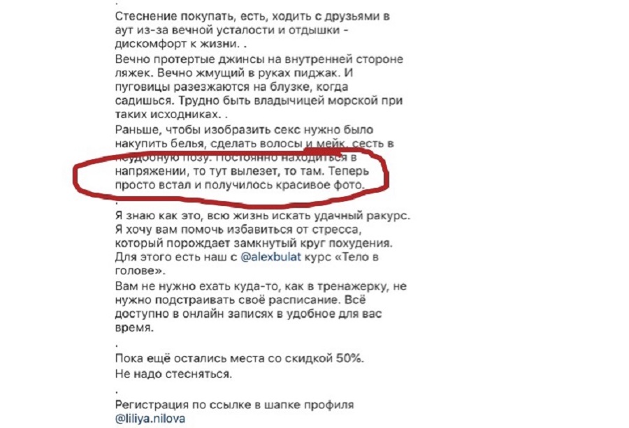 В рубрику «Расследования» «госпожа маркетолог» попала именно за ложь: она давно и с большим энтузиазмом продвигает свой курс «Тело в голове», где неустанно твердит о том, что ей удалось сбросить больше 90 килограммов без вмешательства хирургов, исключительно с помощью здорового образа жизни. В инстаграм-аккаунте Лилии даже была замечена девушка, которая изумленно спросила, зачем Лилия врет — ведь они лежали с ней в одной палате. Комментарий был моментально удален. Хотя если бы мы допустили на минуту, что это у девушки в голове тело, скажем, инородное, и она активно бредит, то лучшим социальным доказательством был бы прямой ответ и в конце концов выписка из больницы об иссечении диафрагмальной грыжи. Разве нет?