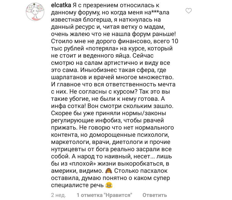 Но ничто из перечисленного выше не мешает «госпоже маркетологу» продавать свои курсы похудения и маркетинга по 10–15 тысяч рублей.