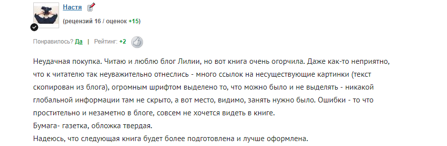 Все, кто отважился купить этот опус, отметили одно и то же. Отзывы все получились абсолютно одинаковыми: содержание — копия «Инстаграма», качество бумаги плохое, верстка странная, отсылки к материалам аккаунта не привязаны к тексту книги. То есть просто не проработанная компиляция.