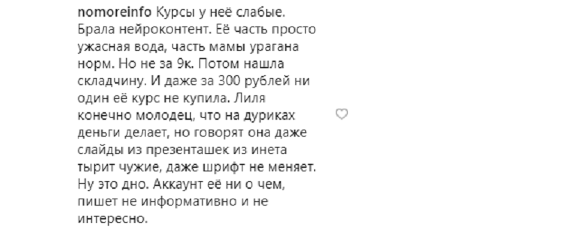 «Я в открытом доступе в телеграмчике наткнулась на Лилин курс "Миллион-интенсив", прослушала, там и правда краткий пересказ книг по маркетингу, кое-какие кейсы она приводит из работы в "Фольксваген" (попутно нахваливая себя, какие типа крутые вещи она придумывала). Я хз какие пизьнесмены поведутся на такое».