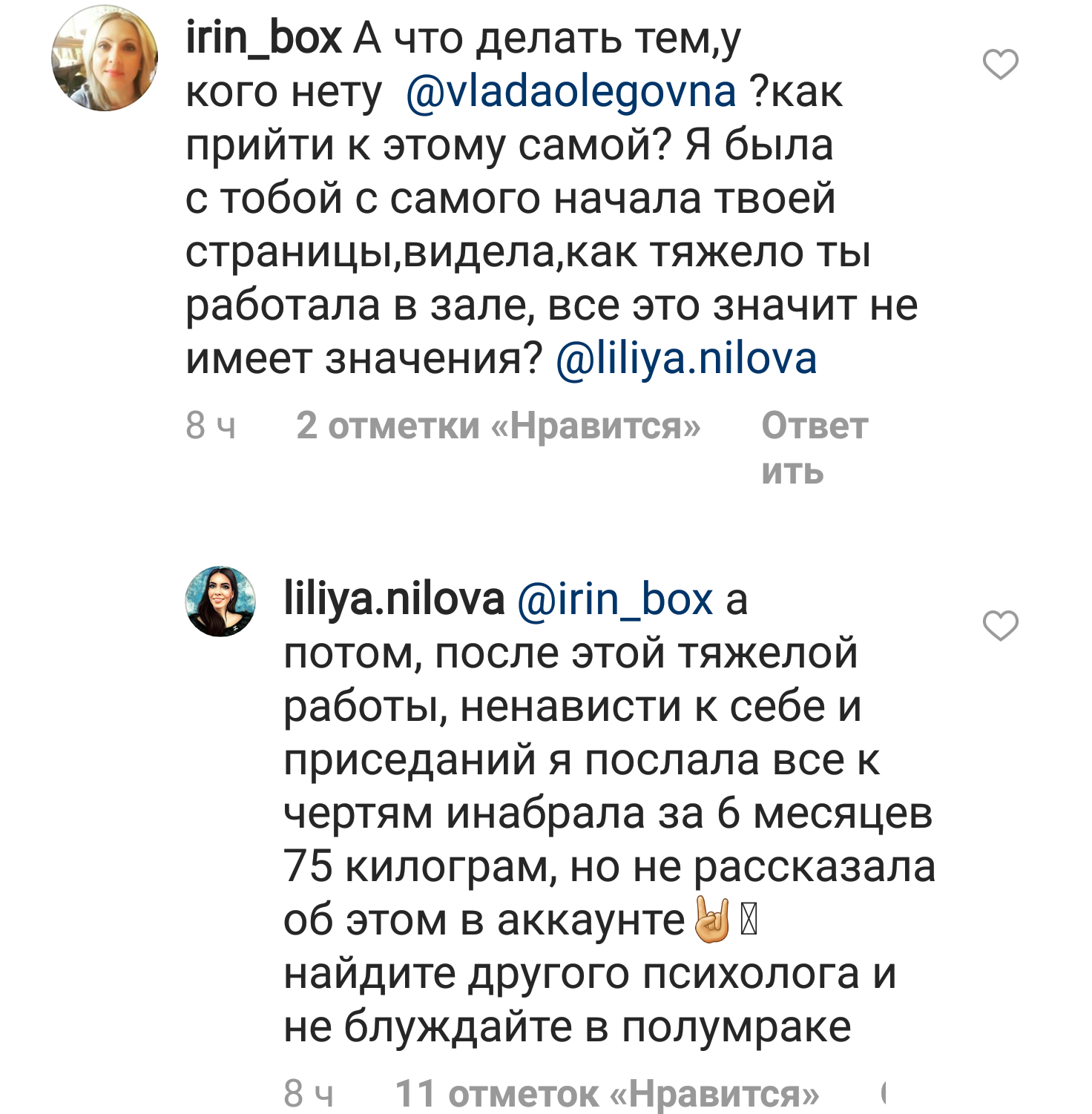 «Читаю ее со времен ее первого похудения, когда у нее была всего пара тысяч подписчиков. Поначалу казалась адекватной девочкой, нравилось наблюдать за ее успехами. Потом появился попартмаркетинг, а у меня к тому времени свой маленький интернет-магазинчик, поэтому мне снова зашло (даже на троих с подружками покупали курс). И так и заходило до тех пор, пока пациента не начало слегка (а потом уже и не слегка) заносить. Бомбануло меня на теме похудения, а точнее на том, что сейчас она на этом пиарится и делает бизнес. Когда я слушала курс, она несколько раз упоминала, что ложится на операцию. Тогда она везде писала, что спорт подорвал ей спину и я подумала, что операция связана с этим. Но потом, увидев шрамы, которые, кстати, особо никто не прячет, и сопоставив факты, я поняла что это была за операция. Курс был в конце августа 2016, операция в сентябре. Похудела Лиля за 1,5 года, по ее словам. Все сходится. А нам теперь вдувает, что надо полюбить себя подружиться со своей головой и будет всем счастье. Оно-то, конечно, будет, только от этого на 80 кг не худеют. Видимо Лиля забыла это уточнить».